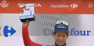Торстейн Трээн в красной майке лидера после 6 этапа Вуэльты Испании-2025